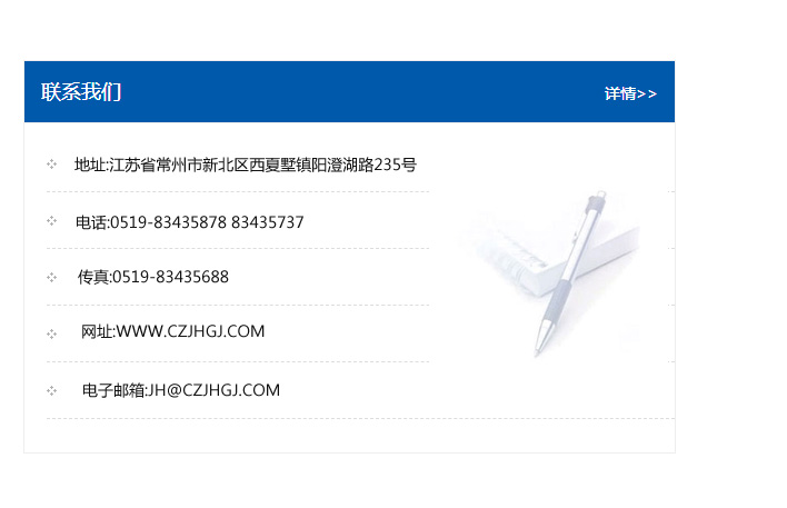 地址:常州市新北區(qū)友邦商務(wù)大廈1幢16、17層  電話:0519-85101652  傳真:0519-85112595  郵編:213022  網(wǎng)址:www.cz-jiayue_cn.cichaxiang.com  郵箱:xiajifengaa@163.com